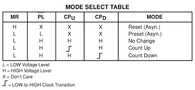 Dan terakhir adalah input D0 - D3, input ini berfungsi untuk menetapkan nilai awal sehingga dapat digunakan pada pin PL, misalnya kita ingin menghitung dari angka 3, maka kita buat pin D0 - D3 ini seperti angka biner 3 yakni (0011), setelah diset seperti berikut, maka pin PL dapat diaktifkan sehingga menetapkan output menjadi angka 3. Untuk lebih jelas kegunaan dari masing - masing pin, dan bagaimana konfigurasi agar IC dapat melakukan operasi perhitungan, dapat dilihat pada tabel berikut ini: